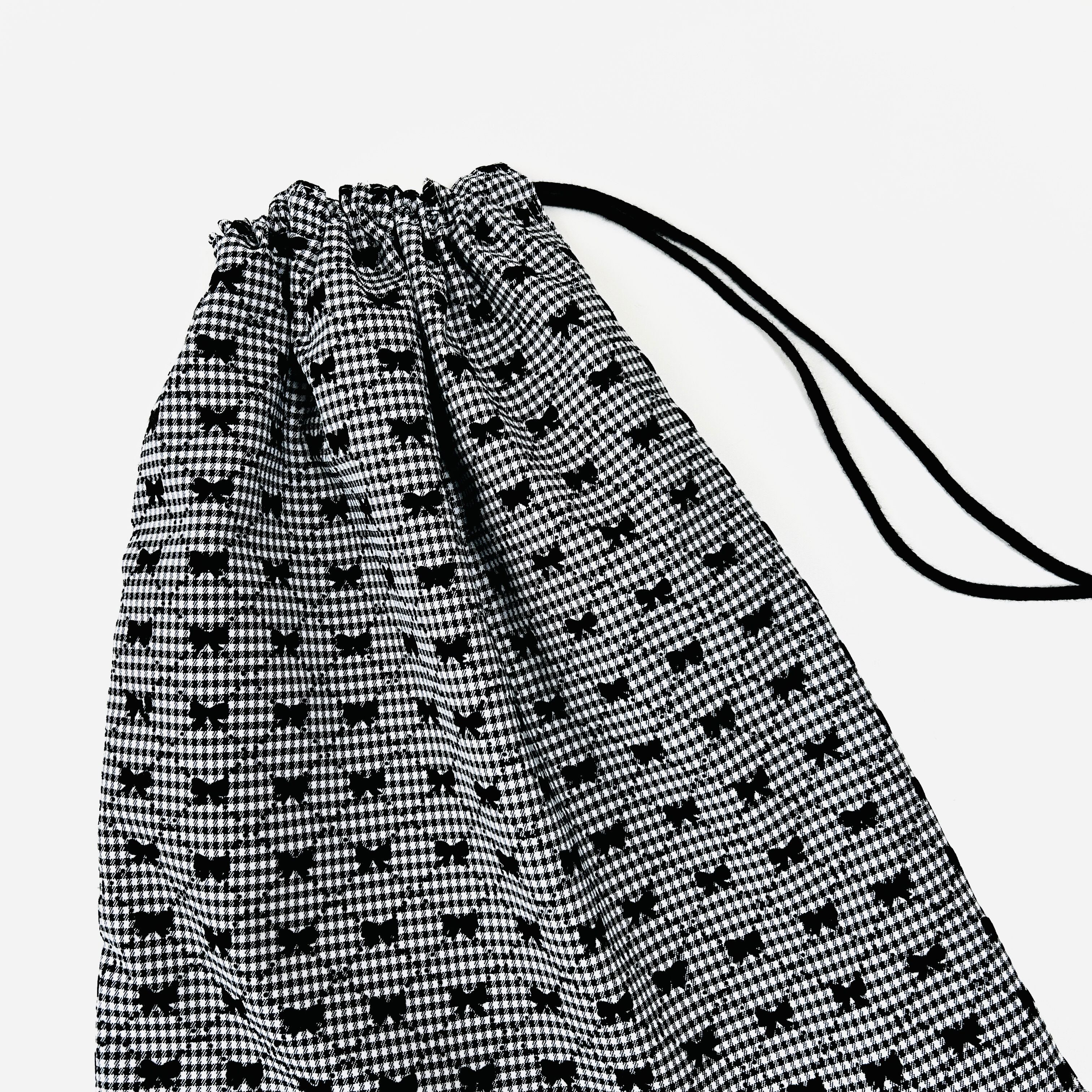 巾着袋 女の子|白黒チェック×立体リボン×裏地付き