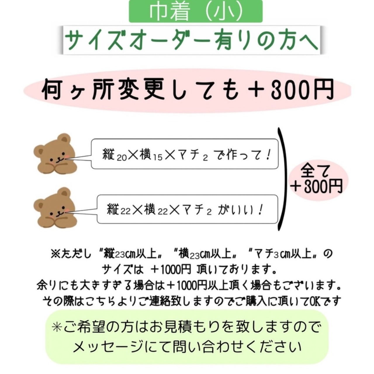 ※ただし〝縦23㎝以上〟〝横23㎝以上〟〝マチ3㎝〟のサイズは +1000円