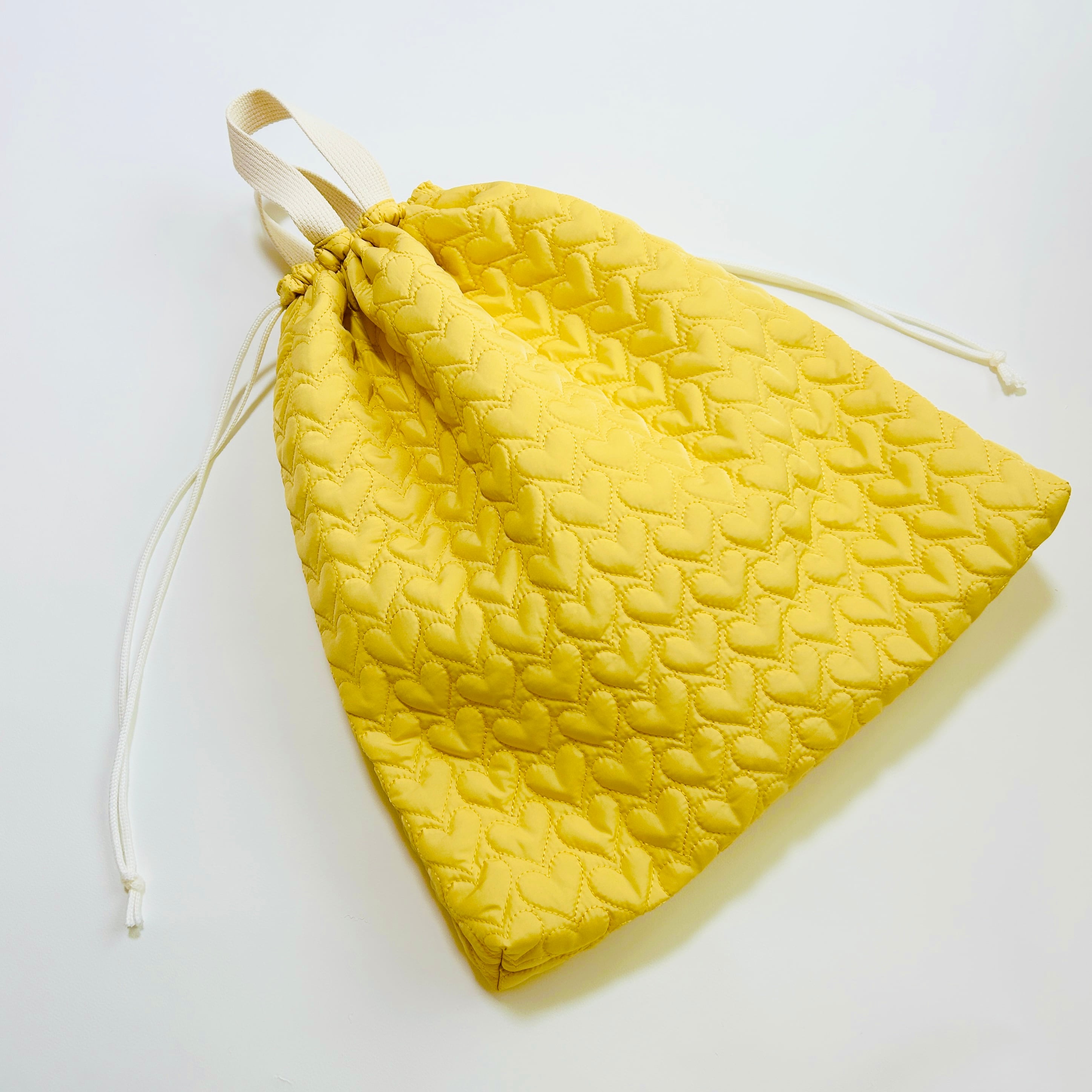 黄色ハート柄×キルティング生地で型崩れしにくく、裏地付きで長く使える日本製。