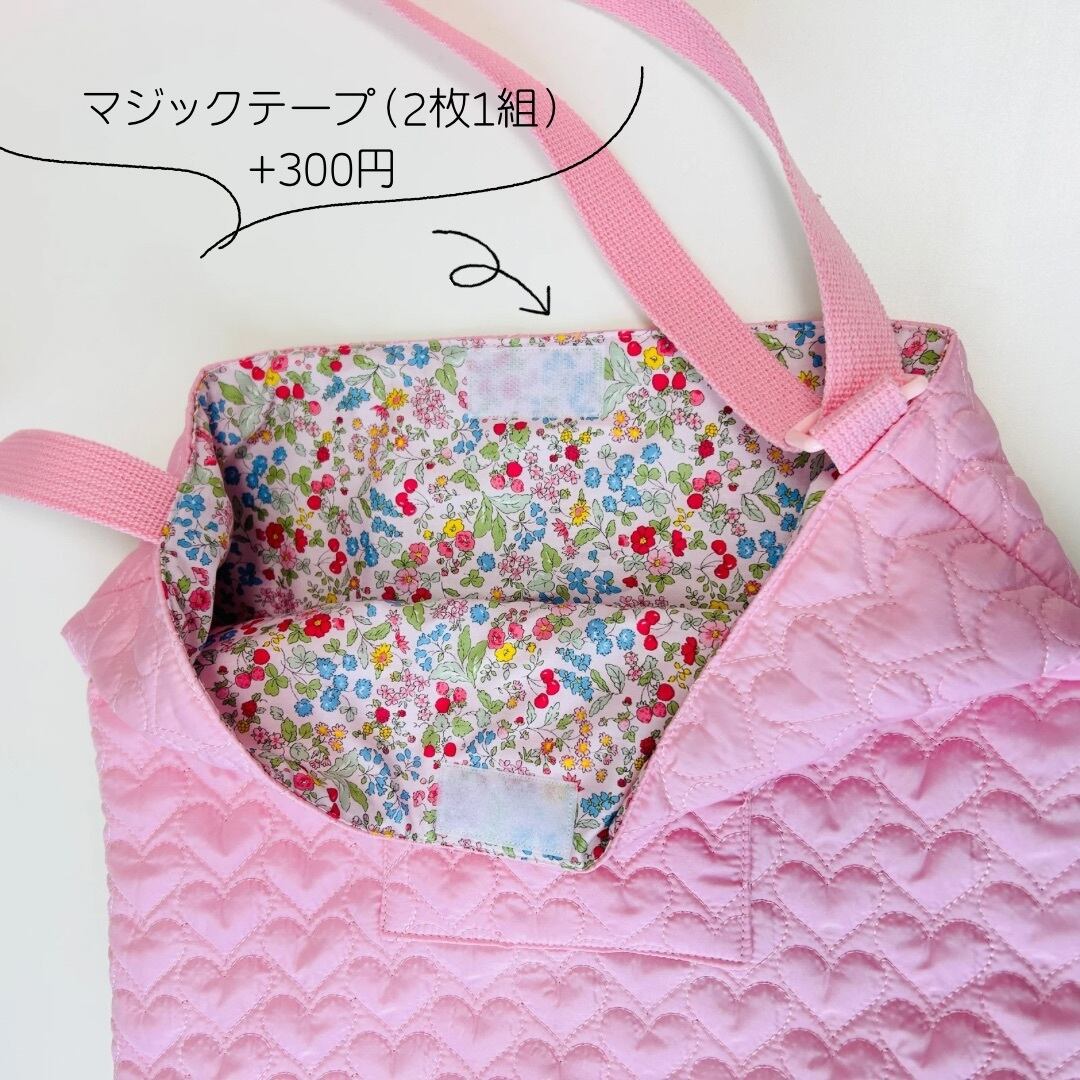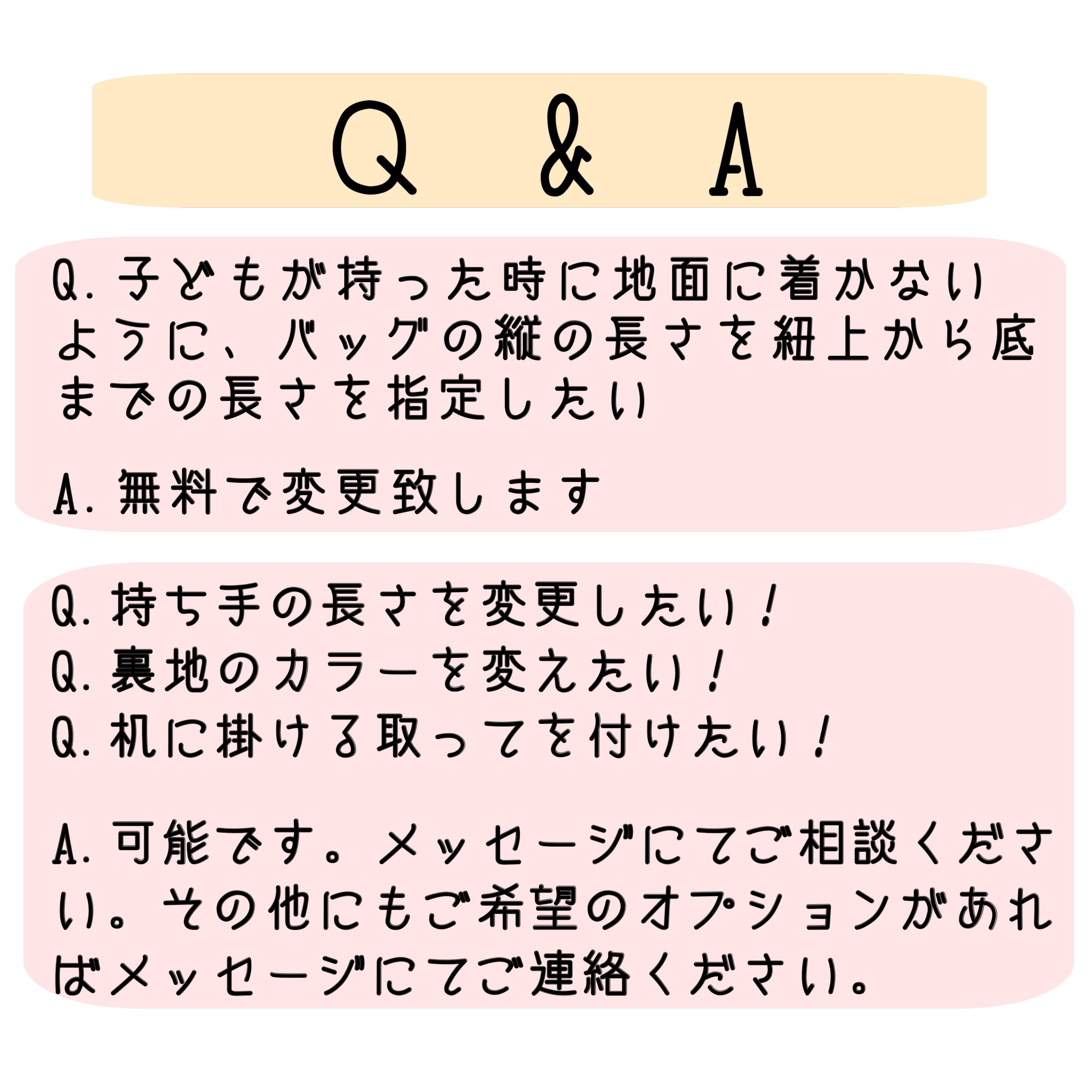 内ポケット¥500/外ポケット¥500/スナップボタン¥300/裏地変更¥300/マジックテープ¥300〜/持ち手カラー変更¥300/机かけフック¥300/肩掛け仕様¥300〜